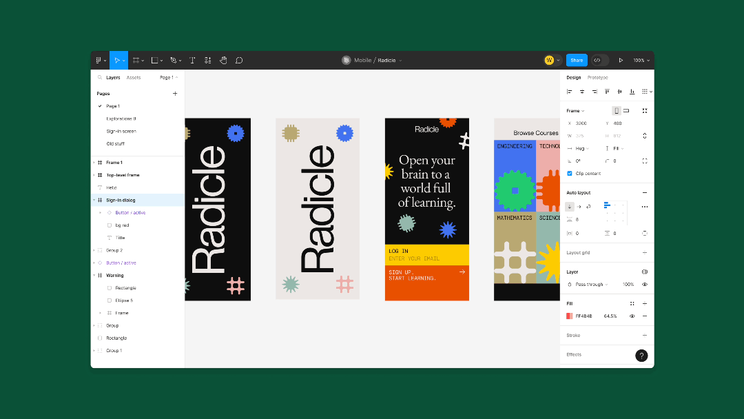 基本功能更新全新的页面布局这是Figma 历史上进行的第三次重大重新设计。这次左右两侧的工具栏从贴边设计变成了悬浮设计(很有之前介绍的原型工具Play 桌面端的味道) ,也能更方便的调整侧面工具栏大小、隐藏展开。原本顶部的一条工具栏被挪到了页面底部,增加了醒目的AI图标。