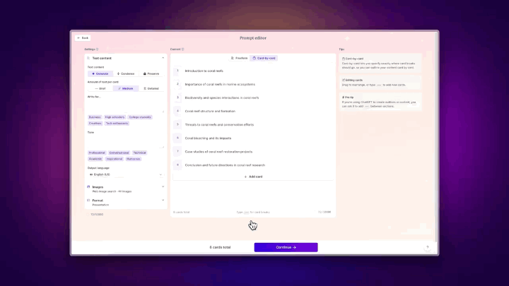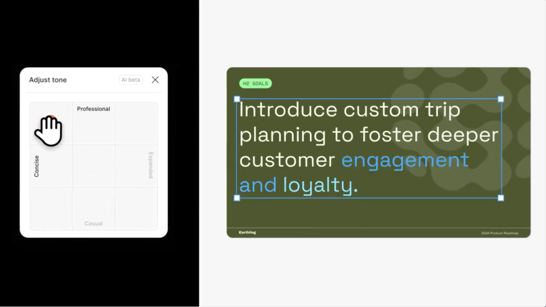 1️⃣ 提供了丰富的PPT模板,有简约的基础版本,也有精心设计的不同主题2️⃣ 可AI调整文本语气,重写文本内容调节语气的交互很有趣,一共包含Professional(专业的)、Concise(简洁的)、Casual(随意的)、Expanded(扩展的) 四个象限,可通过拖拽随意调节范围。3️⃣ 具备Figma 自动布局能力(可以和Keynote说拜拜啦!)4️⃣ 支持Keynote中非常好用的神奇移动动画(我超级喜欢这个功能!)5️⃣ 无缝嵌入原型设计,这对需要汇报的设计师、产品经理来说再利好不过了~~~6️⃣ 支持多人协作