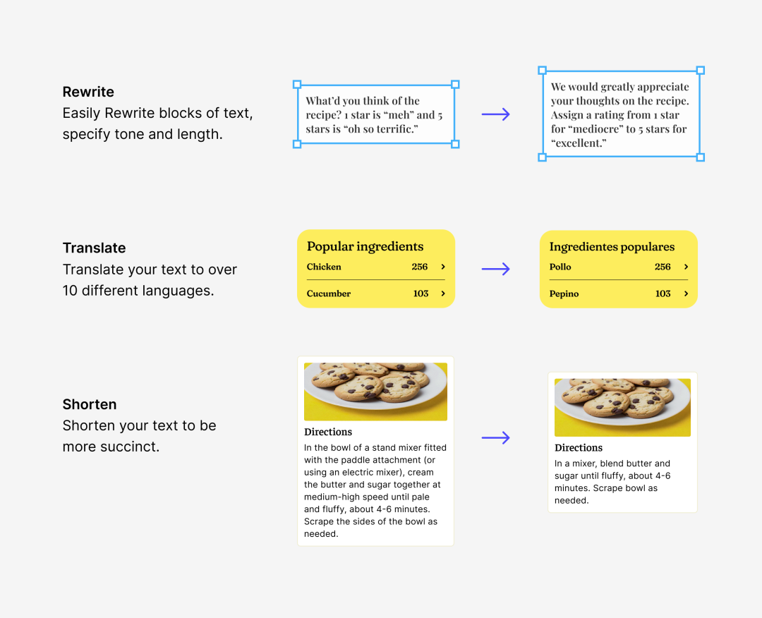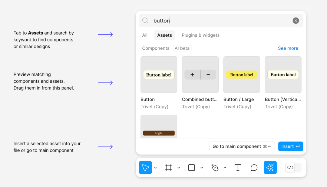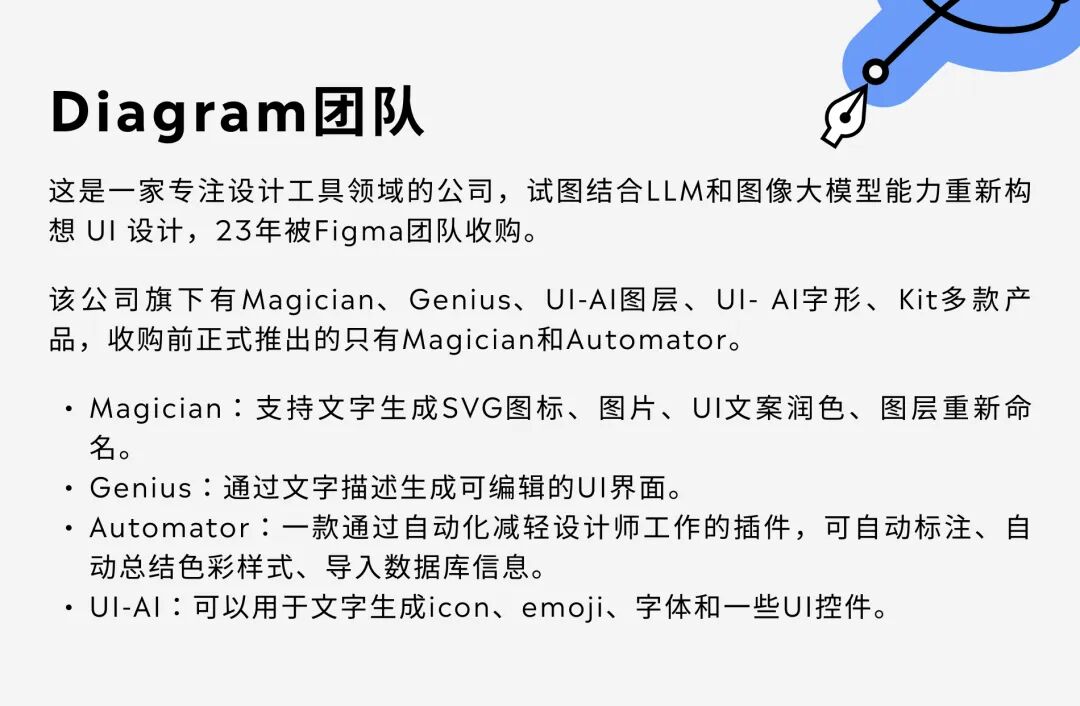 Figma AI收购了AI创业公司Diagram 一年多以后,Figma 终于在AI上有所动作。和PPT能力一样,Figma AI 对所有用户给予一年免费使用期限(目前这里还没有公布定价)。