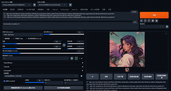 实践过程:1.用SD的isnet_Pro插件将视频转成帧2.选取其中一帧,尝试不同模型、Lora、Prompt下的效果,最终我选取了Counterfeit的二次元风格模型和其对应的VAE,该模型绘制效果偏复古漫画风格。