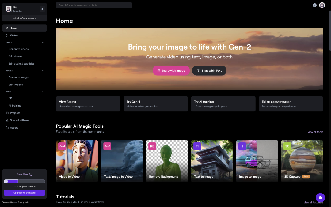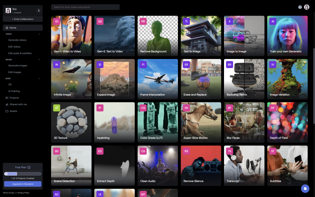 30多项图片、视频处理能力除了最基础的图像、视频生成能力,Runway还提供30多项图片、视频处理能力,包含:Inpainting 视频修复;Motion Tracking视频主体跟随运动;Remove Any Background删除视频元素/背景;3D Texture生成3D纹理等。推荐这个教程,基本功能都有介绍一遍:ai 繪圖 教學 | Ai动画:https://www.youtube.com/watch?v=Yj73NRmeSZM