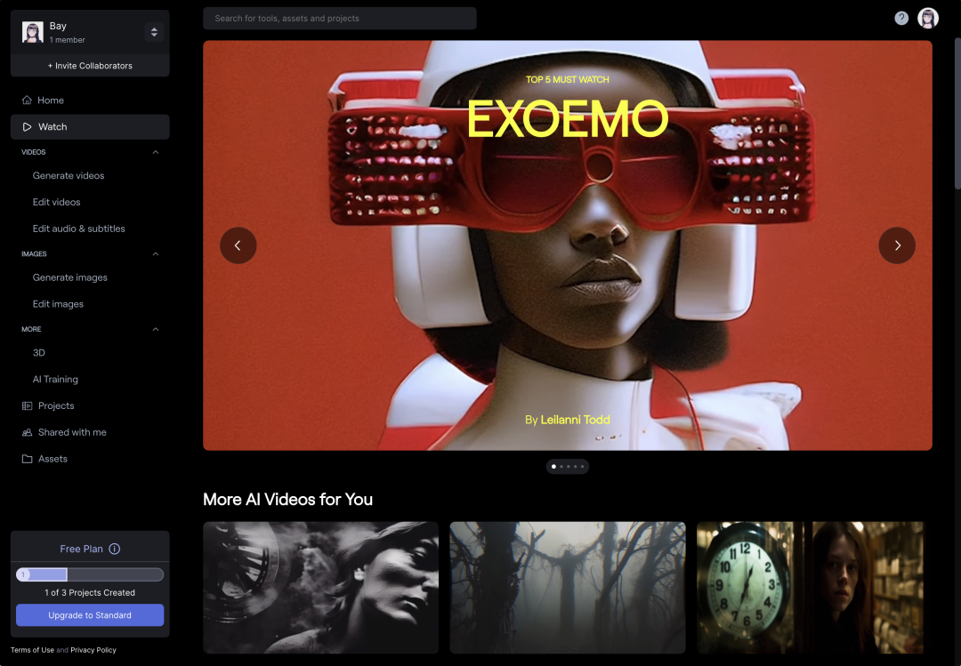 Watch近期Runway控制台上线了Watch 模块,可以查看官方精选的创意案例。