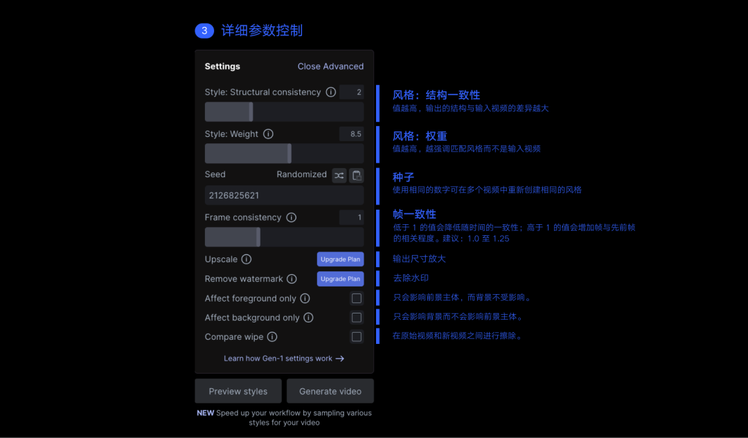 Gen-1 使用流程:Gen-1 能力介绍:https://research.runwayml.com/gen1Gen-1 参数设置: https://help.runwayml.com/hc/en-us/articles/15161225169171也可以看这个视频学习Gen-1的详细设置方式:https://youtu.be/I4OeYcYf0Sc