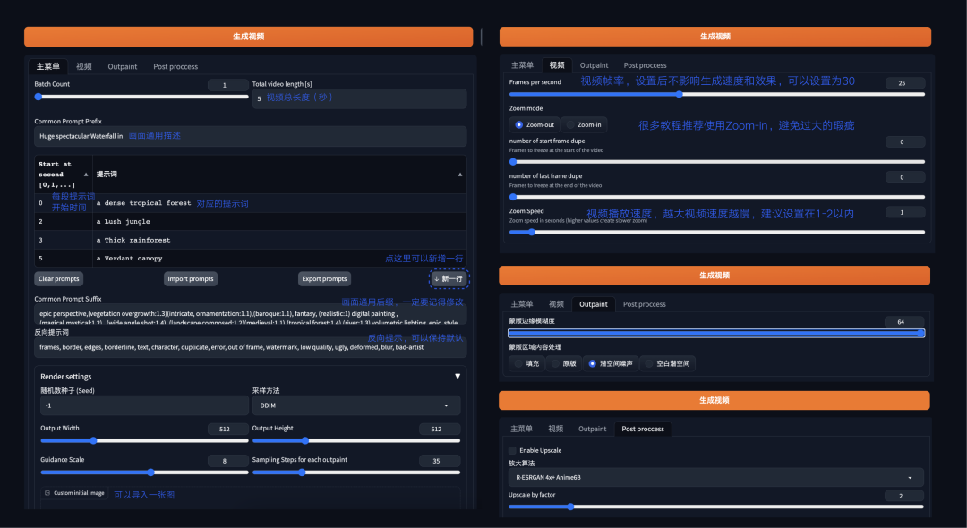 使用方法比起Deforum,Infinite zoom的设置比较简单,生成图片张数和视频秒数相同。