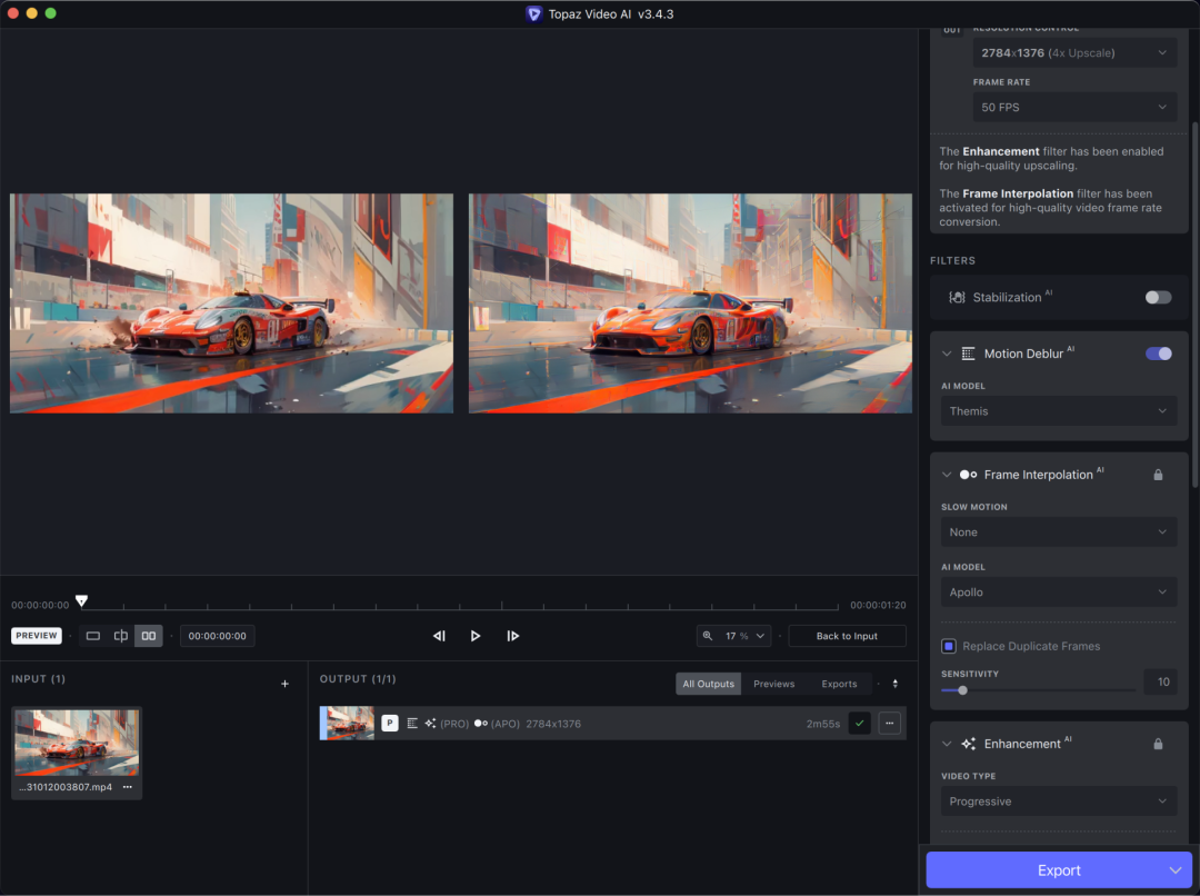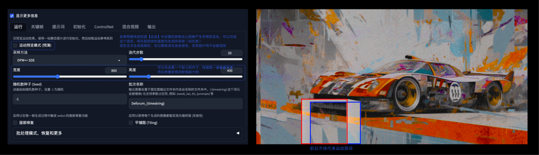 实践过程这里我将Deforum中生成的赛车视频案例拖入Topaz中进行优化,将视频帧率提升至50,并且开启了Motion Deblur,优化后视频闪烁问题有了很大改善。可能受限于视频上传压缩,该效果没法为大家完整传递出来。因公众号文章对视频数量的限制,明日发出第二篇~