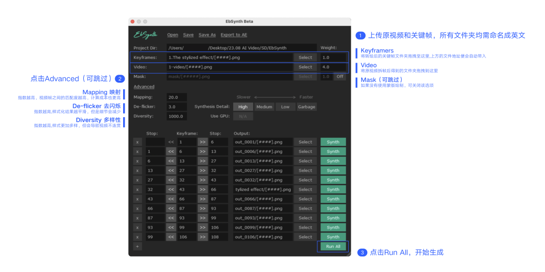 - 打开EbSynth本地应用,在关键帧之间补帧,最终得到了一堆补帧后生成的图片