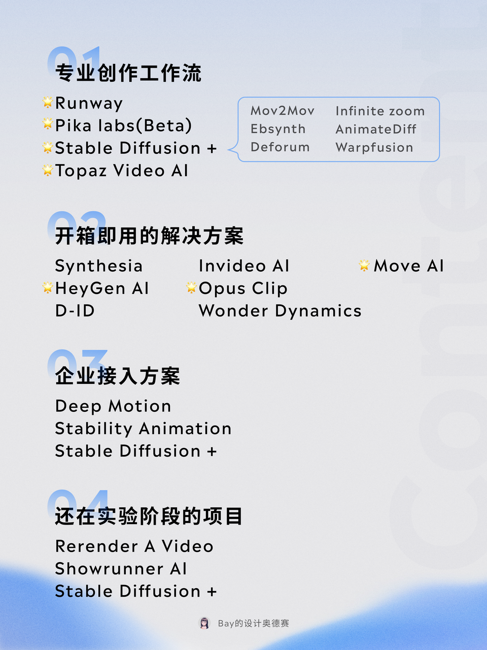 - 文生视频、图生视频(Runway、Pika labs、SD + Deforum、SD + Infinite zoom、SD + AnimateDiff、Warpfusion、Stability Animation)视频生视频:又分逐帧生成(SD + Mov2Mov)、关键帧+补帧(SD + Ebsynth、Rerender A Video)、动态捕捉(Deep motion、Move AI、Wonder Dynamics)、视频修复(Topaz Video AI)AI Avatar+语音生成:Synthesia、HeyGen AI、D-ID长视频生短视频:Opus Clip脚本生成+视频匹配:Invideo AI剧情生成:Showrunner AI