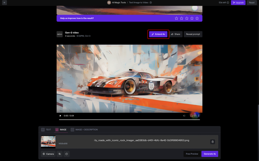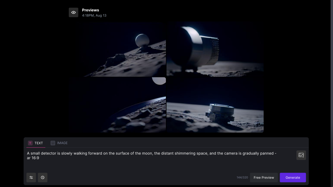 Gen-2Gen-2的主要能力有:文生视频(Text 2 Video )、Prompt+图像生成视频(Text + Image to Video )也支持无Prompt直接图片转视频(Image to Video),通常图生视频时,更推荐使用Image to Video。想要使用Gen-2,点击顶部的Start with Image、Start with Text 即可。🌟Text to Video时,建议优先使用右下角的“Free Preview”免费生成多组图片,然后从中选择一张进行视频生成,这样可以节约credits。Runway最近的更新中,支持将4s的视频延长,每次延长需要消耗20credits ,从Runway的付费情况来看,有点用不起。