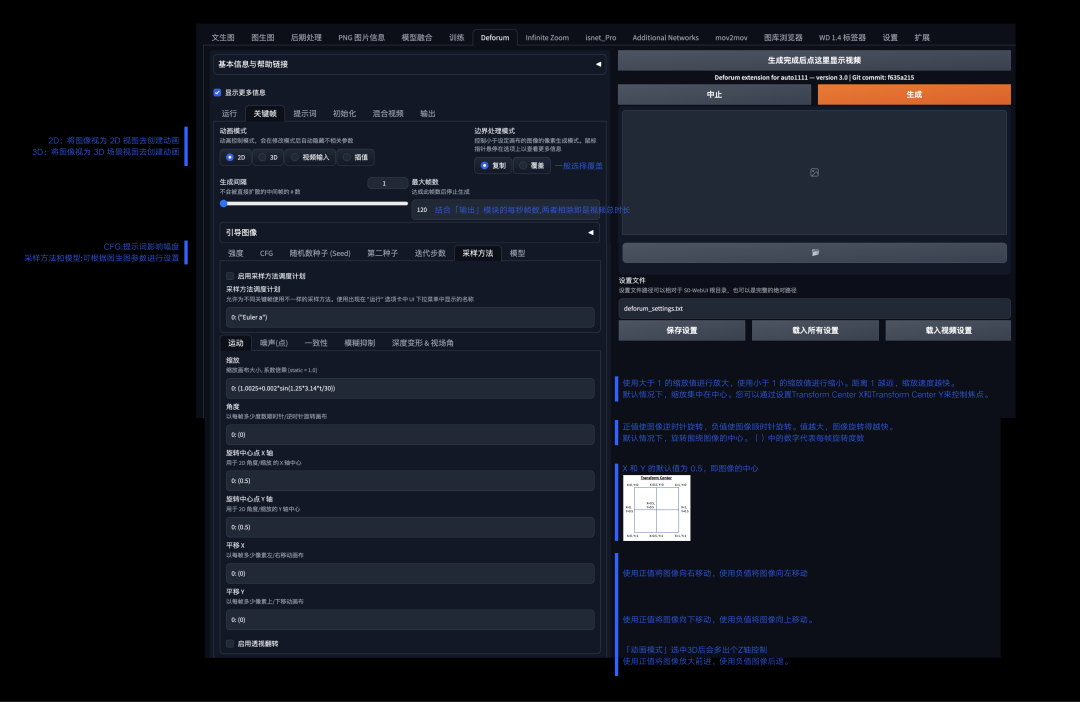 使用方法Deforum的设置比较复杂,需要一些耐心,重要的设置项都在下图中说明了:不同设置项目的差异可以看如下测试,在以下单一参数设置为0:(0.5)时,其中旋转中心点需和角度搭配使用: