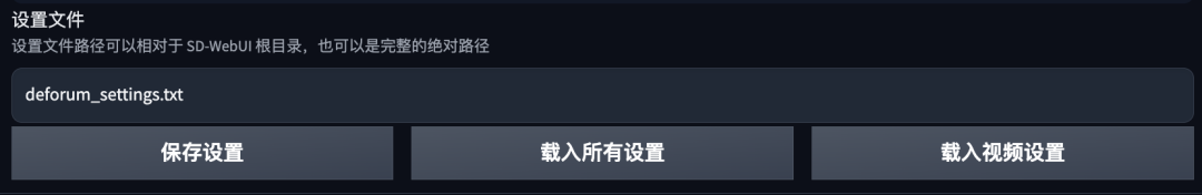 看了上面的设置,你可能会感到头痛,如果我们因为一些原因重启SD,所有的项目都要重新设置一遍吗?这里对比其他扩展,Deforum提供了一个非常方便的能力,点击图片生成区域下方的“保存设置”即可将此时Deforum扩展中的所有设置保存,点击“载入所有设置”,除了初始化图像输入框中的图片需要重新导入,其他都可以直接使用。同时每一次视频生成,Deforum都会将运行的设置项代码保存在相应的文件夹中,方便用户回溯。注:Deforum采取的仍然是逐帧绘制的方式,图片尺寸过大,会导致视频生成时间太长。相应的,缩小图片尺寸,生成的细节和细节质量会降低,在对视频效果没啥把握的前期,建议等比缩小视频尺寸。生成满意的效果后再按大图生成最终视频。
