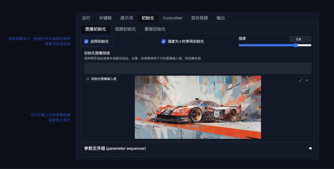 实践过程这里我选了一张在Midjourney中绘制的赛车图像,想要描绘赛车在赛车场上飞驰的画面。生成时主要用到了3D控制实现了车身偏移的效果,并且添加了镜头的缩小放大。在尽管比Mov2Mov生成的效果更好,但Deforum还是没法避免闪烁,后面我将介绍另外一款产品Topaz VideoAI来解决这个问题。