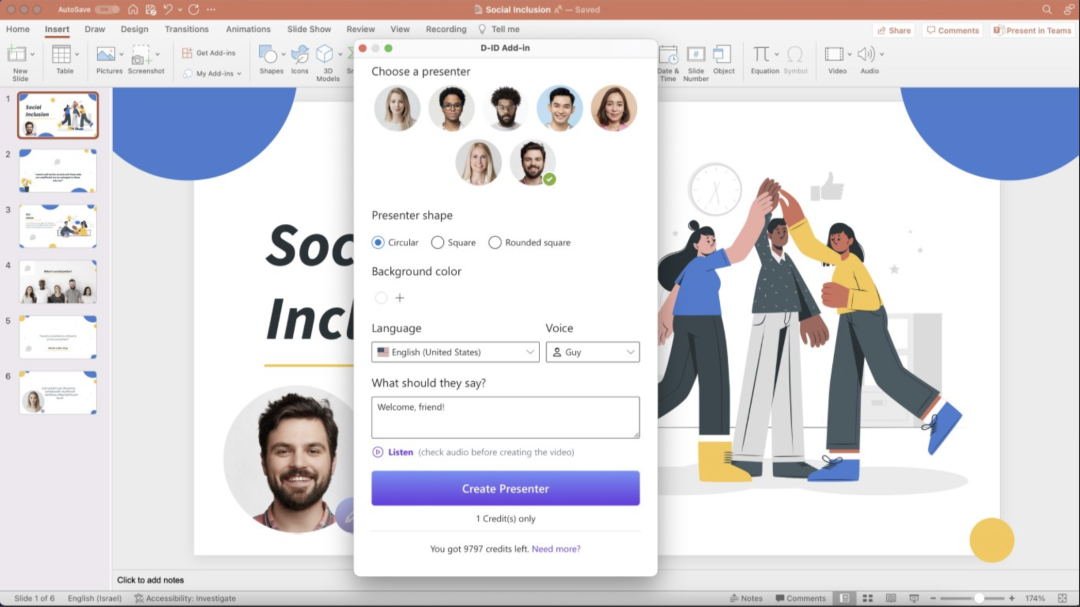 D-ID产品特点D-ID来自一家以色列AI创业公司,该公司此前推出的“Deep Nostalgia”(将老照片中失散已久的亲人的脸动画化)和“LiveStory”(在动画照片中添加音频,让照片中的人讲述自己的生活史)等项目曾在Tiktok 等社交媒体上疯传。D-ID主打方向同样是AI Avatar生成视频,比起Synthesia、HeyGen AI、D- ID提供了更多credits(20个)让用户试用。除了 AI 视频生成器之外,该公司还提供与 Microsoft PowerPoint 兼容的 AI Presenters,允许用户将虚拟演示者添加到幻灯片中并创建更具吸引力和互动性的演示文稿。