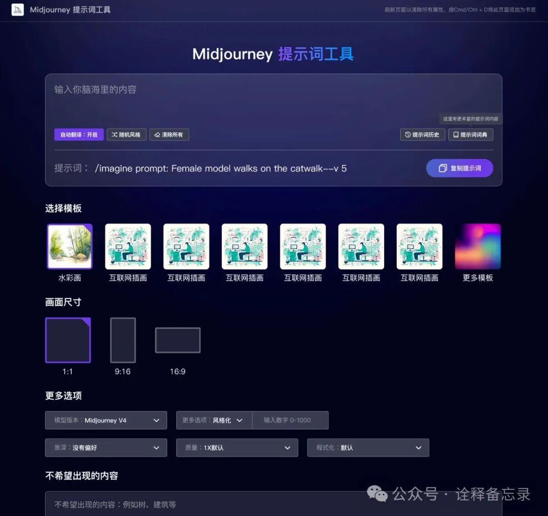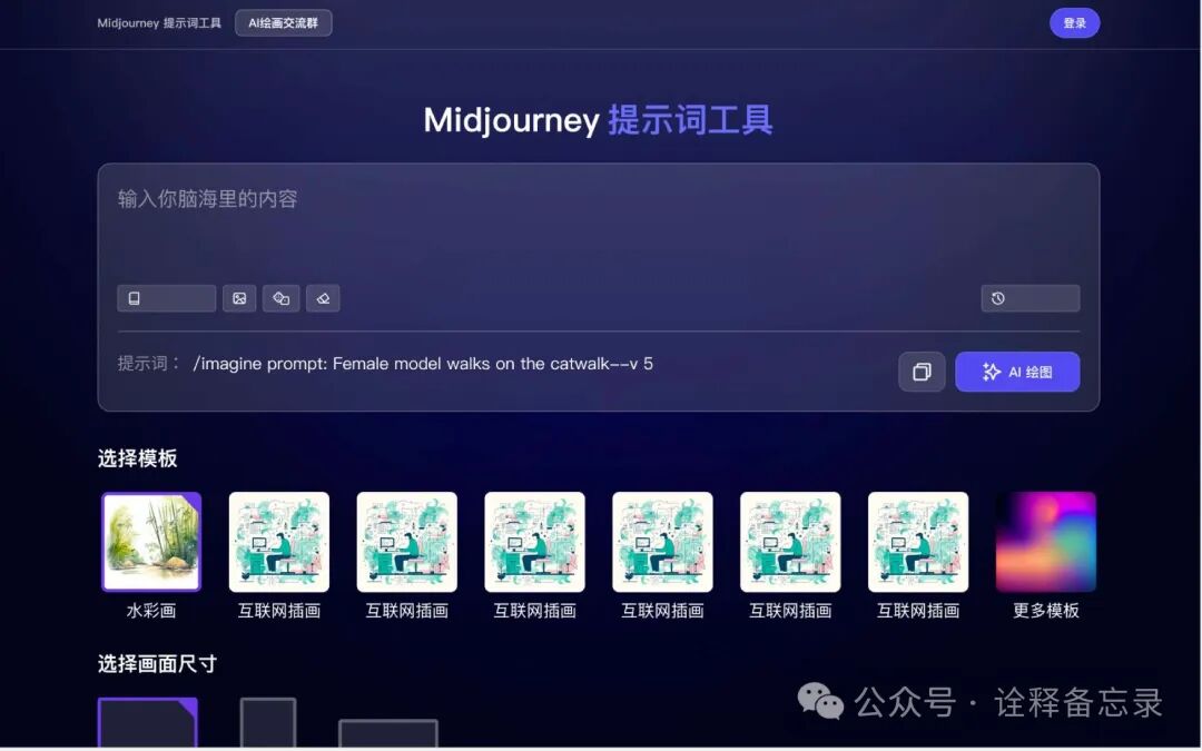 开发完这个版本,全栈开发大哥走了,去全职创业了同期,开启了第一波互联网「找人」行动...其实那个时间点,感兴趣人还是不少的,因为大厂刚好在这个时候集体裁员了几波,导致互联网上想试试独立开发人特别多。我前前后后聊了 20 多个人做了一系列筛选。最后有两个兄弟从各方面评估都不错 👇一个是美团的 p8(技术栈不对,导致接手项目特别困难,浪费了 1-2 周时间,离开)一个是一路小厂的技术小辉(野路子,有过相关的经验,开发速度也比较快)在 4 月底上线了新的版本增加了 MJ 模版,类似于 SD 的 C 站。用户可以非常简单输入提示词,选择模板就可以得到他想要的风格。也是一项创新,借用模版的概念来简化不同的需求,产出质量高的提示词。本质还是那个点,帮助用户最大效率的写好 prompt,围绕这个点逐渐做优化。