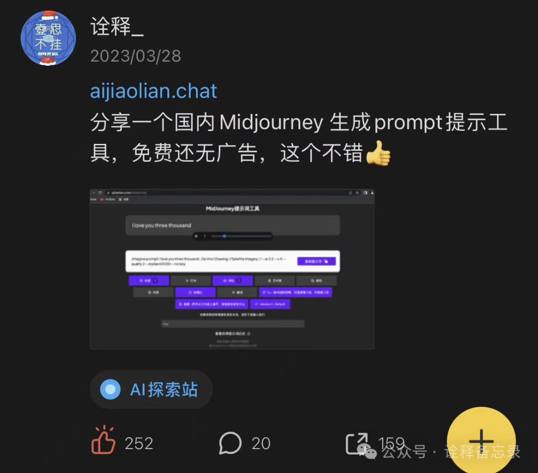 2023 年初的时候,我记得大家都很兴奋,感觉新时代要来了,MJ 发布了 V4,第一次接触的我叹为观止,chatGPT 也是火的大红大紫。即刻发布了一场 hack 马拉松,参加了组队,认识了一些志同道合的朋友,那次团队组成了,项目没成,但是认识了三个人,后边一起做了 openflow(ex 腾讯、字节全栈大佬,歸藏,字节产品运营),所以说多认识「同路的朋友」还是有好处的。2023.03因为自己本身也在用 midjourney,没事玩一玩,就发现这个东西模型好是好,但是 md 这个 discord 用起来太费劲了,复杂的参数格式,还不支持中文。想着看看搞一个提示词工具试试,整理了一些常用提示词,跟前边提到的全栈老哥说了一下思路,一拍即合就搞了,一开始很简单就是纯前端,增加常用的提示词和系统命令。为测试下用户的反馈,试探性的发了一个即刻帖,当时获得了 250+的赞,霸榜了热帖近 1 周,直接 🔥 了... 👇