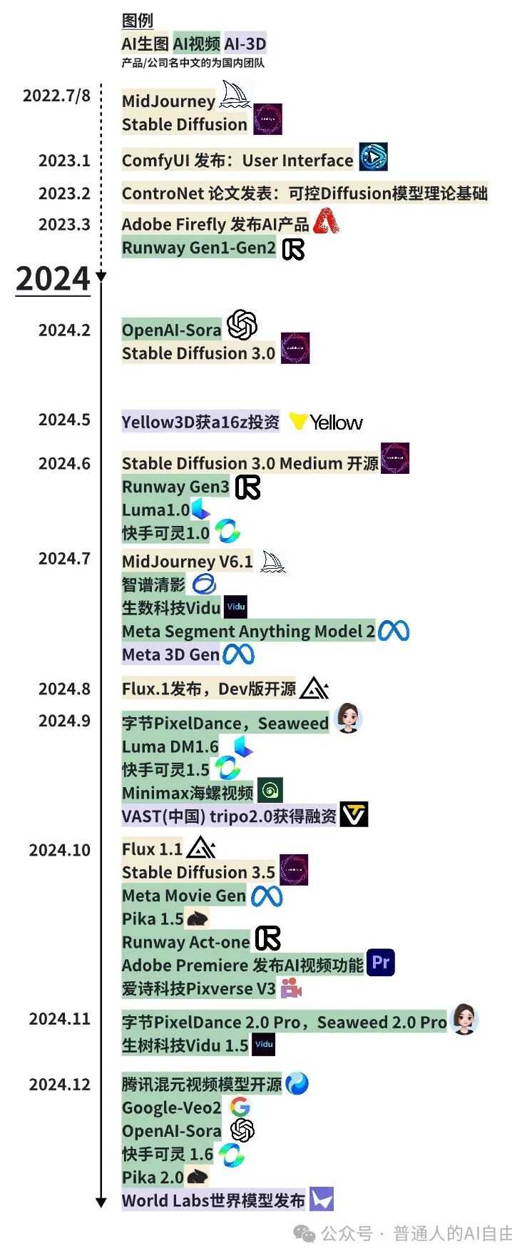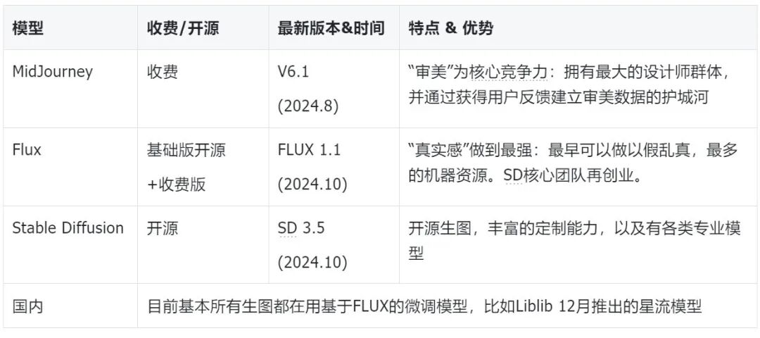[作者]Lian, Sylvie, MK; [视觉] Tracy正文<1> 群雄鏖战的20242024年是视觉多模态大爆发的一年。AI生图:真实感以假乱真,可控性商用成熟,竞争格局基本确定AI作图最早始于2022年7-8月的Midjourney和Stable Diffusion。最开始阶段因为没有可控性,所以只有很少鬼畜整活玩家和先锋实验艺术家在使用6个月之后,2023年2月发布的ControlNet让Diffusion Model开始变得可控;ComfyUI的出现让模型的产品化门槛大大降低,艺术家们可以自己上手体验了1年之后,接着Adobe FireFly的发布,到了2023年下半年,AI作图开始进入商业应用领域2年之后,2024年8月发布的Flux让生图“真实感”有了质的提升,商业应用基本成熟现在AI生图的赛道已经基本稳定,且开源模型能力已经很强,所以在模型层次上颠覆生态已经非常困难。当前的“三足鼎立”各家都有特点,应该还可以持续一段时间。国内也是基本在用Flux和SD的开源模型做微调。