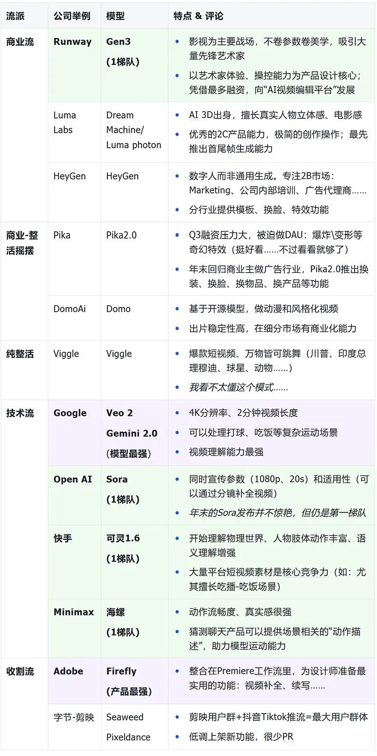MidJourney、Flux、Stable Diffusion生图风格对比可以说,AI生图已经进入“下半场”:模型可卷空间有限,重要的是场景的理解、客户的理解。比如:品牌propritery模型、室内装修模型、工业设计模型……这类专业模型仍然有大量商业空间。AI视频:群雄鏖战,融资不易从年初SORA宣传视频放出后,市场全面拥抱DiT (Diffusion Transformer) 架构,各家一路狂奔卷出天际。今年发布闭源基础模型的公司国内外就有十余家,这里面不只有创业公司,也有各家大厂。我们也看到,各家不仅在模型技术上狂卷,PR上也非常用功:不仅各类技术榜单的刷榜已经偏离了实际应用体验,更是没有哪个自媒体可以中立完整呈现各家的水平。模型究竟哪家好?最好的标准还是眼见为实:看各家做出视频的样子。这里面最中立完整的应该是腾讯的一篇学术文章和网站。确实,在大家狂卷的时候走“开源+测评”的方式,不失为一种聪明的选择,正所谓“打不过就做裁判”。https://ailab-cvc.github.io/VideoGen-Eval/index.html在看了如此多的测评和PR稿之后,我尝试把各家公司分成几个流派: