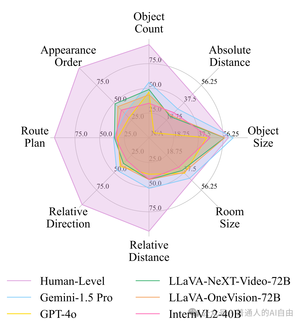 多模态理解:比多模态生成更重要和视觉生成相比,多模态理解的进展要慢得多。将近一年以来,视频理解基本只有Google的Gemini可以做到。到了2024年12月,OpenAI o1支持基于多模态理解的长推理,月之暗面的k1和阿里通义刚刚开源的QVQ也很快跟上。李飞飞和谢赛宁的新研究提出了VSI-Bench,可以用来检验模型的空间理解能力,也就是通过看视频,来推理和理解其中的空间关系,比如看一个room tour的视频来估计房间的面积。这种推理在人脑中是不经过语言的,因此现在依赖语言的视觉理解模型的学习的数据中就很少有这部分能力。