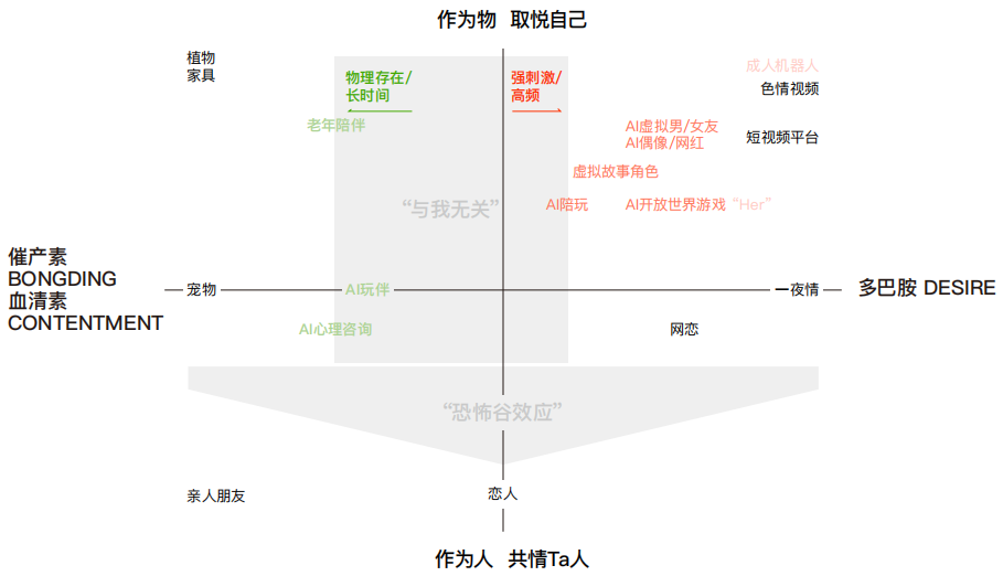 2.2 陪伴的分类有了上面的讨论基础,我们就可以把当前各类的“陪伴”放在一起做对比。•X轴-主观心理体验:多巴胺 vs 催产素+血清素•Y轴-陪伴对象的主体性:作为人 vs 作为物我们首先把日常生活中的各类“陪伴”放到下边这张图上:•最狭义定义的陪伴在左下:来自亲人与朋友 •“宠物”在正左:我们可以赋予宠物人格,但宠物终究无法成为人•“恋人”在正下:我们与恋人相处时,既有催产素/血清素的稳定,又有多巴胺的激情•“网恋”/“一夜情”在正右:由多巴胺主导的我们,在寻求刺激与激情的同时,也把人“物化”•视频类在右上:我们是消费内容的看客•“植物”/“家具”:虽然不能交流,但物理存在也可以给我们熟悉与抚慰的体验这张图中两个灰色的区域代表的是“无法建立陪伴”的地方。意思是说,如果产品落到这个区域里,是没有办法与用户建立陪伴关系的。•第一个区域中间偏左:这里意味着神经递质过于稀薄就无法产生陪伴。向右提升多巴胺主要靠增加刺激频率和强度。向左提升催产素和血清素则需要物理实体和长时间存在,而向左这个方向更难一些。•第二个区域片在下部接近完整真人的位置:这一区域会发生“恐怖谷”效应,也就是说用户会因为分不清真假而感受到恐惧,也就不会使用产品。这个问题在AI生成图像、视频、3D的领域中尤其突出。(后文会详细展开)在这张图的基础上,我们又把当今和未来一些可能的“AI陪伴”产品放了进来。我们会看到,一方面受到当前技术能力限制,另一方面也受到用户对于AI“作为物”的认知,