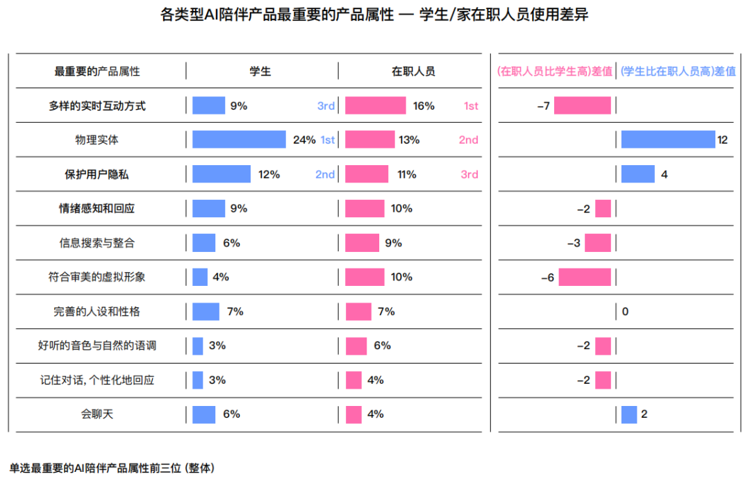 学生保护秘密,职人想要物理实体相比职场人,学生对于AI陪伴产品的隐私保护要求更为严苛(超12%),他们对AI陪伴产品在解决隐私问题上的能力存在一定顾虑。职场人对频繁互动的需求较高,16%的职场人将实时互动视为最重要的产品属性。同时,职场人也比学生更希望AI陪伴产品具备物理实体,以增强陪伴感。而在具体形式上,学生整体更希望AI陪伴产品的物理实体达到“人形机器人”的水平(37%),职场人和学生相比则更加实际,不少人偏向于可穿戴设备(27%)。