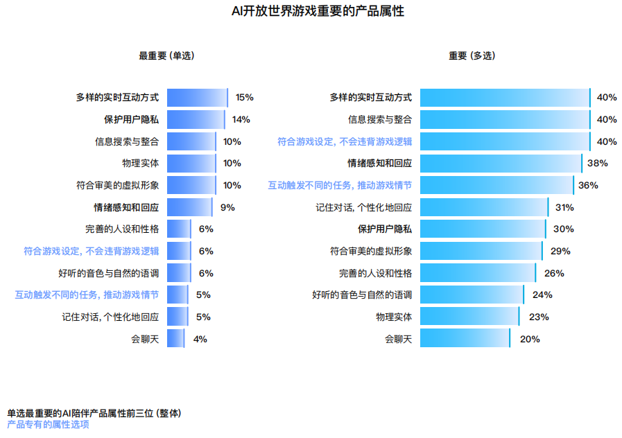 为了探究用户的深层次诉求,也为了给产品设计启示,我们还进一步询问了“AI虚拟故事角色”中最重要的产品属性(黑色文字是所有AI产品中都提供的选项,蓝色文字是仅对于这个产品增加的特殊选项) :我们看到,除了“多样的实时互动方式”和“情绪感知和回应”这两项基础之外,在“虚拟故事角色”赛道中最重要的是