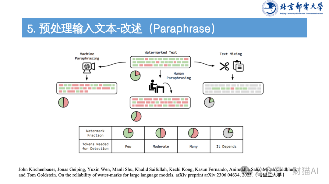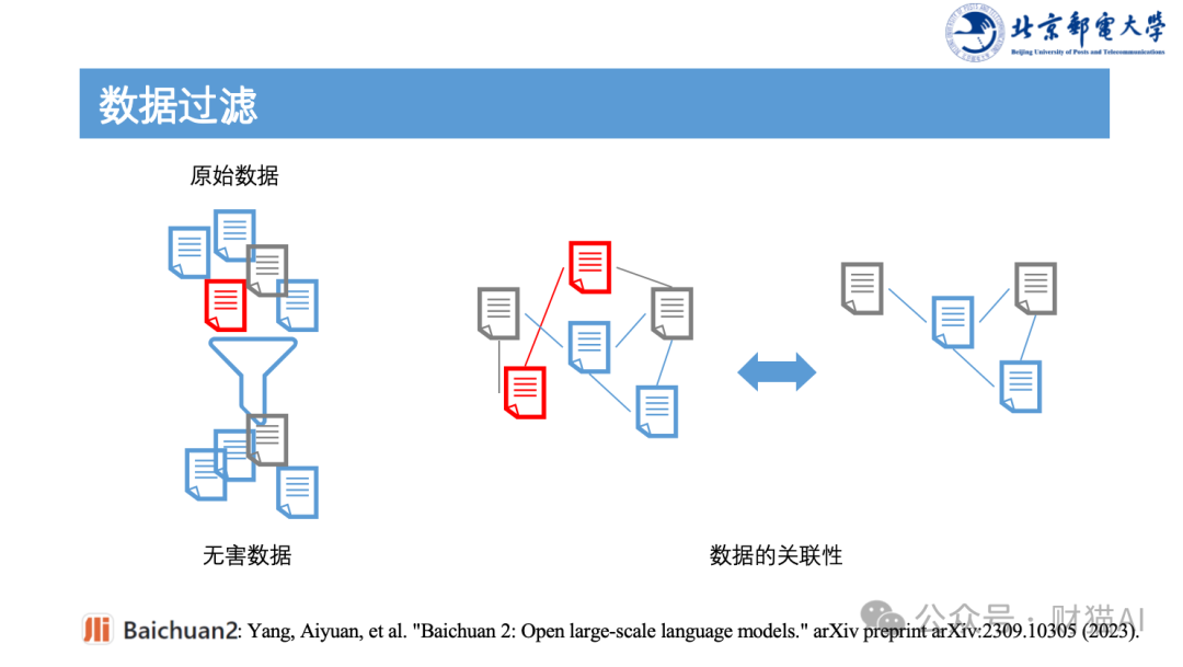 就是我们在预训练阶段,对模型的预训练数据进行过滤,不让模型学习那些我们不想要的有害知识,例如图示中的红色文档,灰色文档则代表有一定有害数据,但达不到过滤阈值的这样模型学习到的知识中就不直接包含这些有害数据了但此方法往往应用于工业界,例如baichuan2在其开源的技术报告中就提到他们使用了这种技术进行了数据过滤,用于减少模型的有害输出但是考虑到数据之间的关联性,即使一些有害信息丰富的文档被删除掉,但大模型仍然可能从数据的关联中学会有害的内容,并且在面对不良信息时,模型缺少相关知识,反而有可能