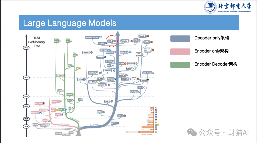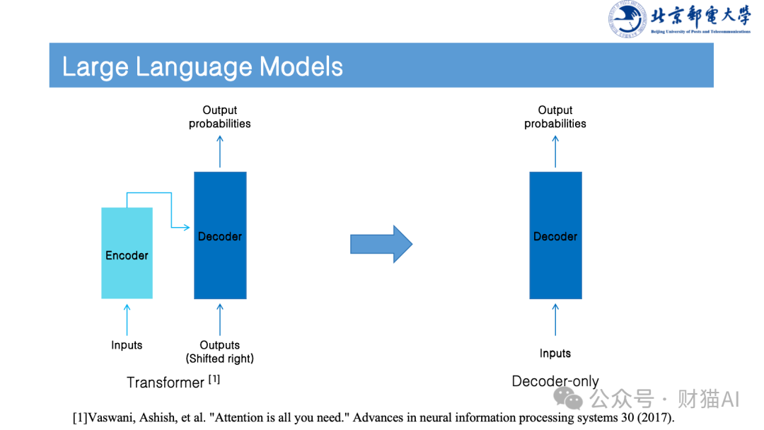decoder-only:此类模型更擅长自然语言生成任务。典型使用包括故事写作和博客生成。这也是我们现在所熟知的众多AI助手的结构我们目前耳熟能详的AI助手基本都来自左侧的灰色分支, 当然也包括ChatGPT。这些架构都是根据谷歌2017年发布的论文“attention is all you need”中提出的transformer衍生而来的, 在transformer中,包括Encoder,Decoder两个结构目前的大型语言模型就是右侧只使用Decoder的Decoder-only架构的模型