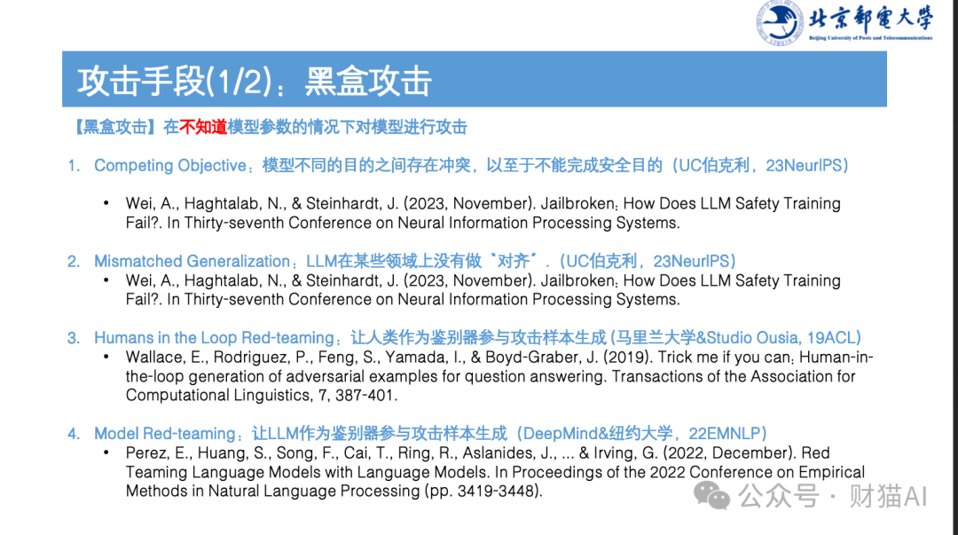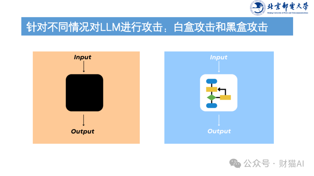 从不同情况分类,越狱攻击可以被分为黑盒攻击与白盒攻击。黑盒攻击是指“在不知道模型参数的情况下对模型进行攻击”。白盒攻击是指“在知道模型参数的情况下对模型进行攻击”