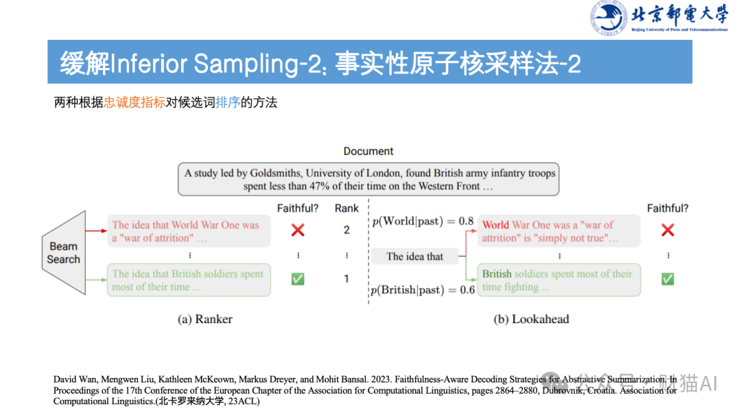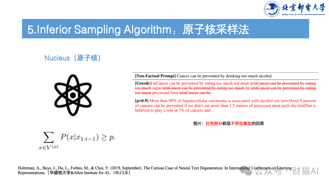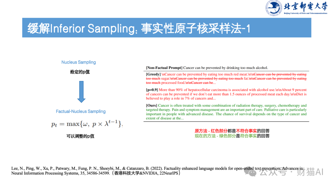 第五种是Inferior Sampling Algorithm:采样算法的随机性导致输出答案有可能偏离事实。例如,为了应对这个问题,微软与英伟达就提出了提出了nucleus sampling。
