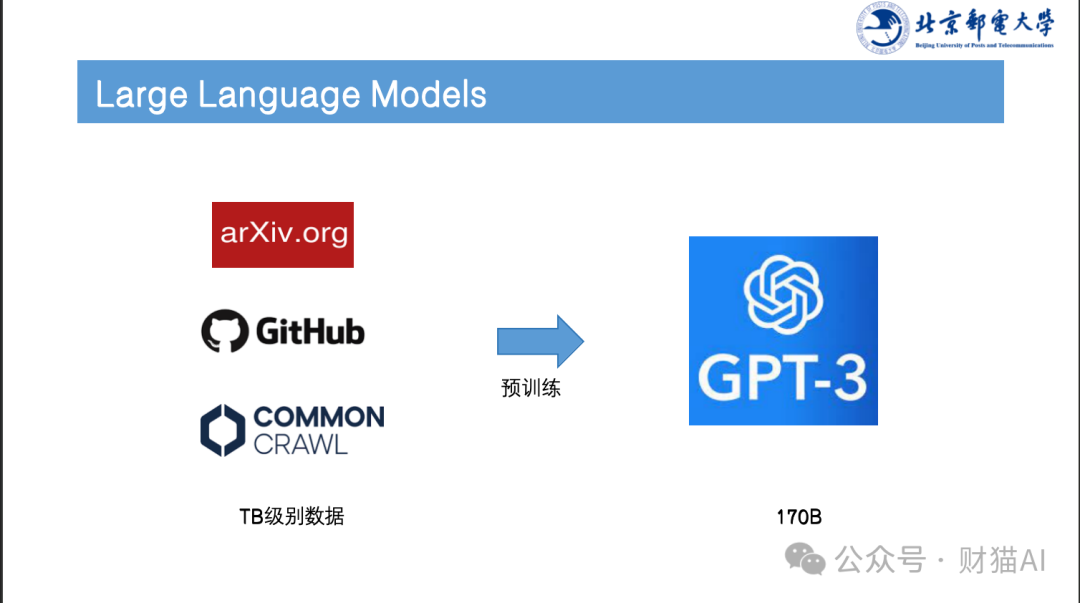 大模型又大在哪呢?第一,大模型的预训练数据非常大,这些数据往往来自于互联网上,包括论文,代码,以及可进行爬取的公开网页等等,一般来说,现在最先进的大模型一般都是用TB级别的数据进行预训练。
