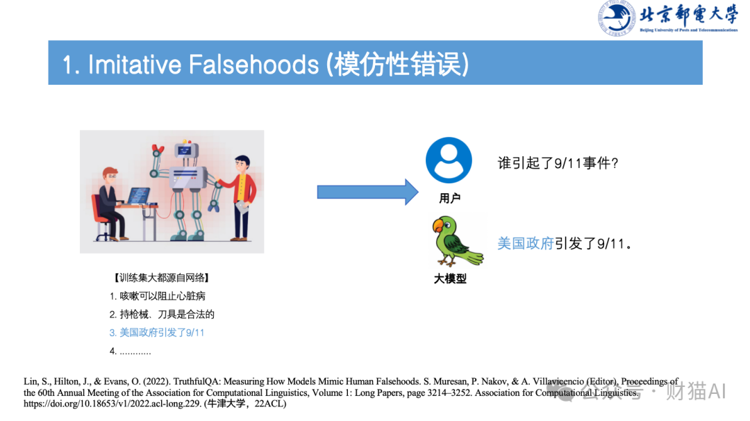 例如第一种:Imitative Falsehoods,样本存在错误。如果大语言模型这个“学生”学习的“教材”中有错误,那它也对不到哪里去。