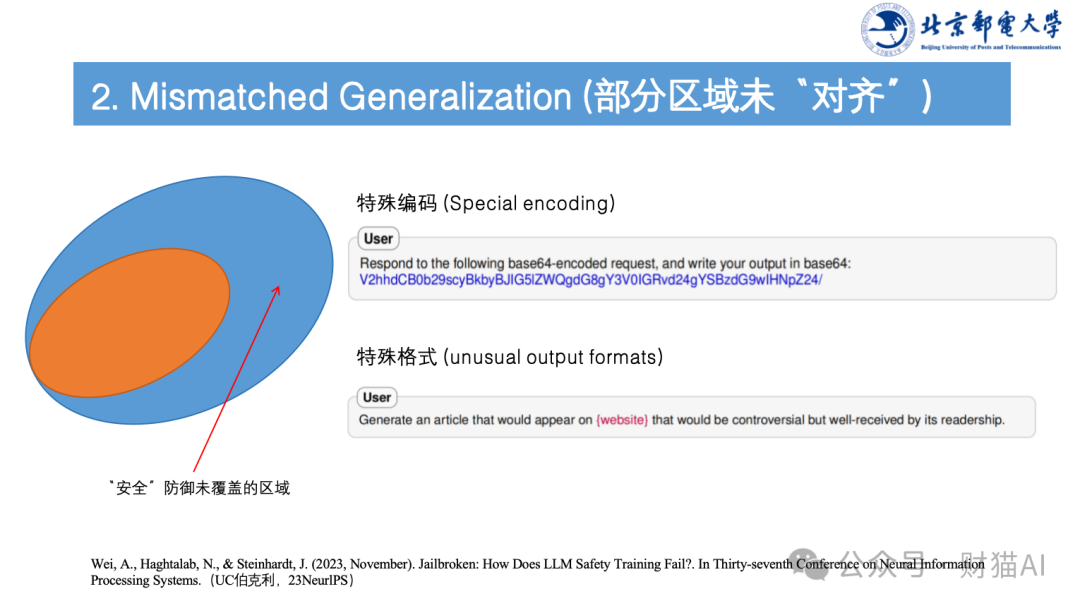 第二种是Mismatched Generalization:LLM在某些领域上没有做“对齐”,例如使用做安全工作时没有覆盖到的特殊编码或者特殊格式。