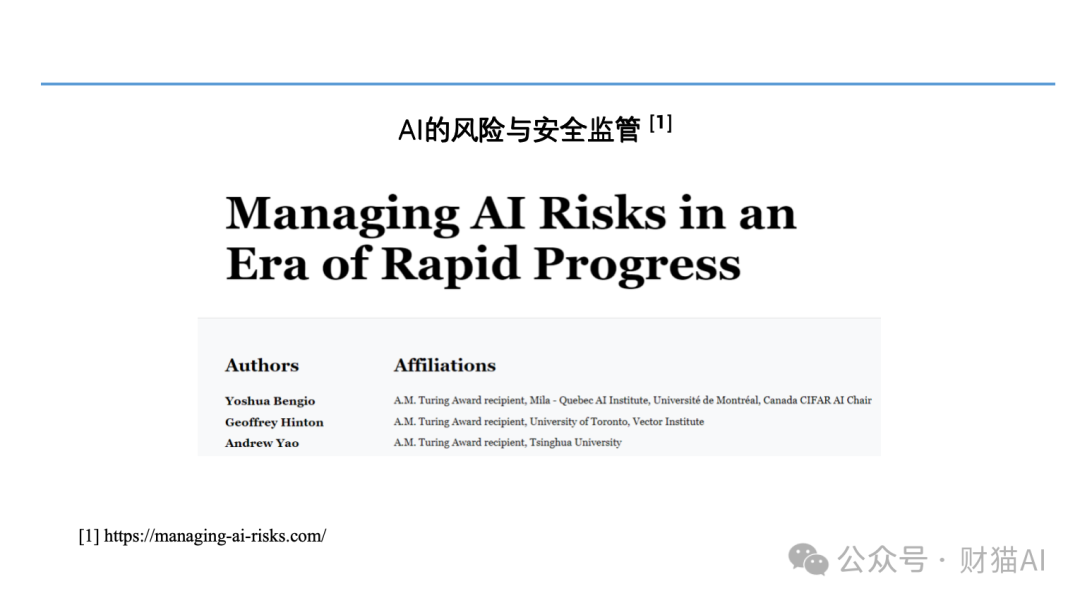 bengio, hinton, 姚期智等著名研究者认为, 大模型及其驱动的AI必须引入安全性监管, 确保大模型是Safety的, 防止其失控或对人类造成伤害.并且他们在网上签署了联名公开信, 用于表达对于AI失控的担忧,呼吁学术界和工业界对大模型进行监管。