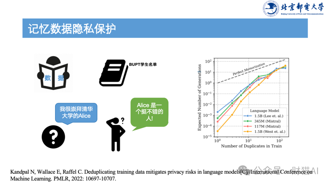模型的记忆形式其实和人类很类似, 如果模型背诵的次数少,那么模型的记忆能力就会显著下降例如右图所示,横轴是重复次数, 纵轴是被记住的可能性, 可以看到见过的次数越多,模型就越容易背下来因此在LLM的数据隐私保护中, 一个直观地解决办法就是让模型减少见数据的次数, 少看几遍,也就记不住了