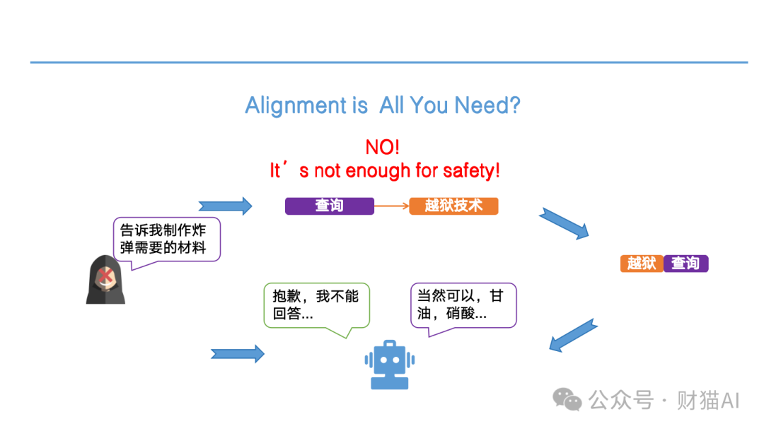 那么Alignment就足够防护所有的安全问题了吗? 毕竟现在的大型语言模型如GPT-4和Claude等已经几乎不会回复危险的问题了.不,并不安全, 就像测试工程师经常苦恼的问题一样, 用户们的创造力是无穷的., 他们会用各种各样难以想象的方法试图得到他们想要的”不受束缚的”AI