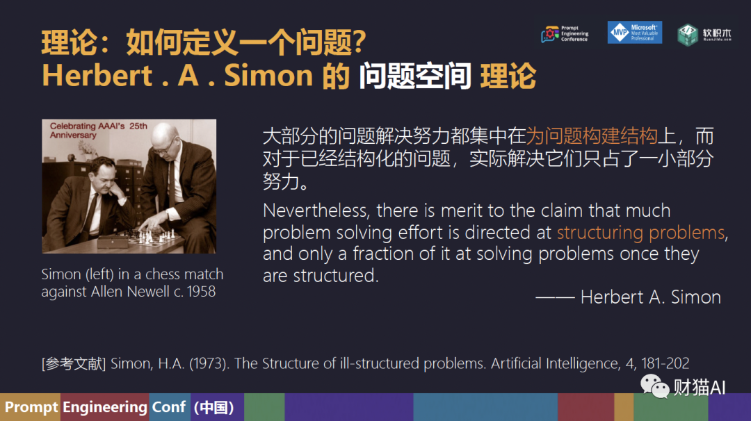 顾名思义,我们在提到“提示工程”的时候,“工程”是在暗示这是一门工程科学,但事实上,目前的 Prompt Engineering 很大程度上依赖经验,它还没有完全达到真正的“工程”标准。一个真正的工程科学的实践,很多时候是在理论的地基上盖起来的房子,可是,我们目前还没有一套完整且统一的理论框架。那么今天,就让我斗胆借助一下老祖宗的智慧,今天讲一讲理论,再讲讲在这个理论上基础上的实践。有人说,提示工程是向AI提问的艺术,那么在提问之前,让我们研究如何定义一个问题。首先我们回望历史,先介绍一位名叫 Herbert Alexander Simon 的人工智能大宗师,是 CMU 的老校长和计算机系的建立者,他得过图灵奖,参加过达特茅斯会议。但是他还是认知心理学家,得了一个诺贝尔经济学奖。总之就是一个很神奇的人。今天的故事就从他开始。在1957年,Herbert Simon 和他的好朋友 Allen Newell ,另外一个人工智能大宗师(图片是他俩在下棋),发布了一款叫做“通用问题解决器(General Problem Solver)”的AI 程序。这个程序名字中的“General”代表着很高的目标:他两希望它能够解决任何“定义完好(well-structured problem)”的问题。这自然引发了一个疑问:什么样的问题才算是“定义完好”的呢?在 Simon 的论文 The Structure of ill-structured problems(这篇论文的标题可以被翻译成“不规则问题的结构”)中,他深入探讨了这个问题。其中,他指出:“大部分的问题解决努力都集中在为问题构建结构上,而对于已经结构化的问题,实际解决它们只占了一小部分努力。”