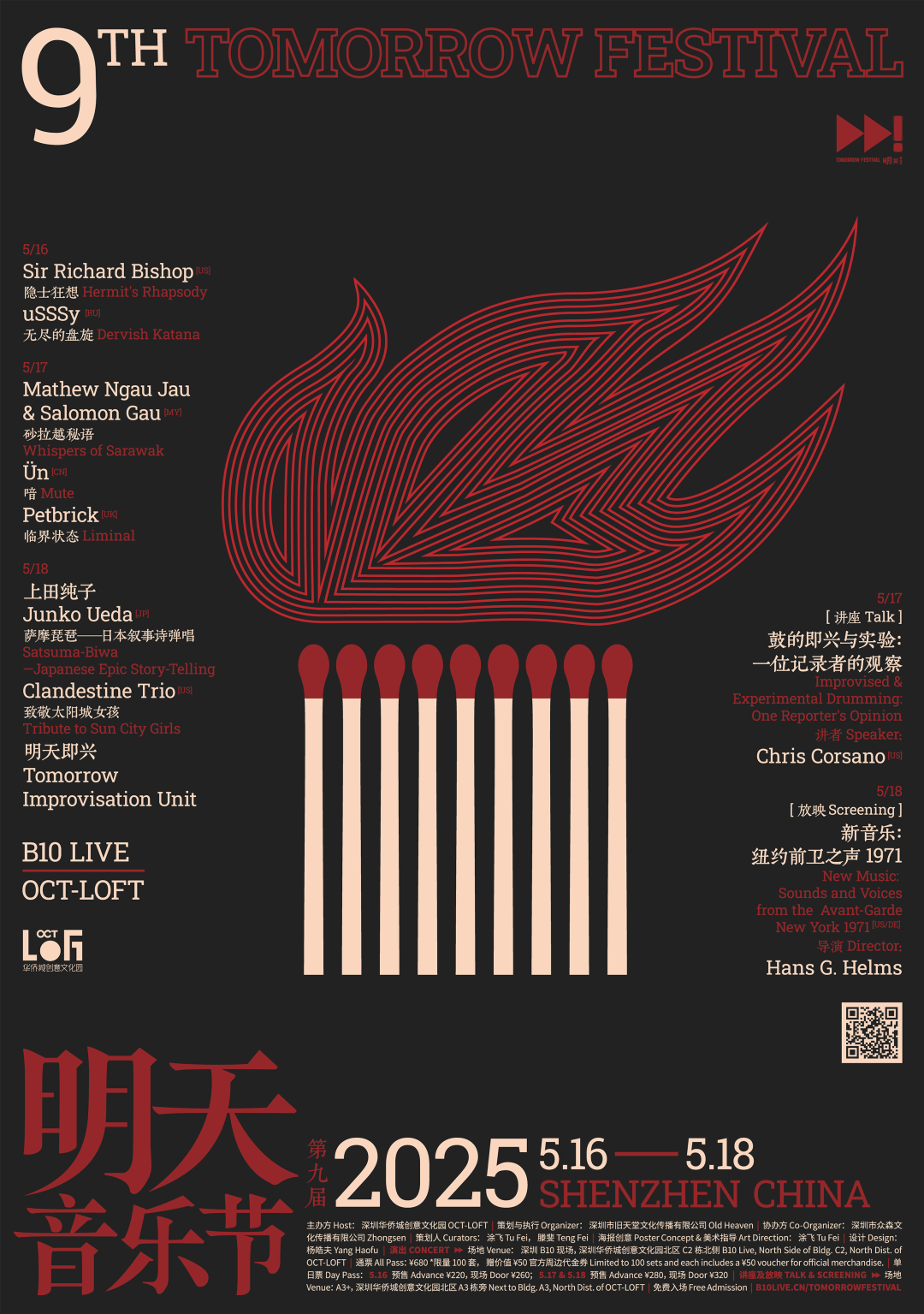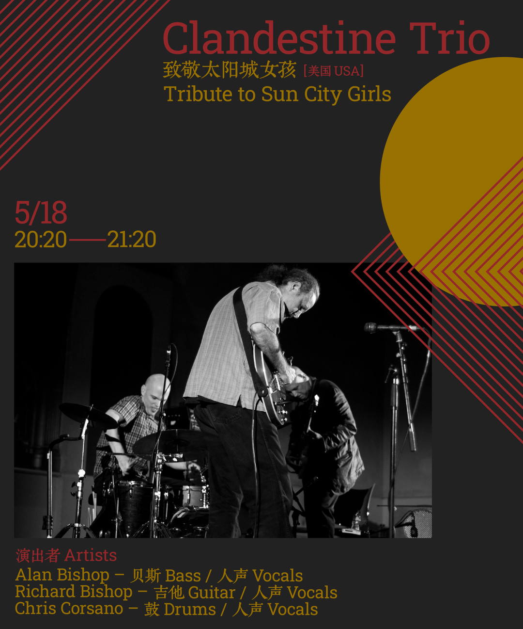 这场演出是对 Sun City Girls 的特别致敬。Sun City Girls 创始成员 Alan Bishop 和 Richard Bishop,携手即兴音乐家、鼓手 Chris Corsano, 组成 Clandestine 三重奏,将在明天音乐节的舞台上全新演绎 Sun City Girls 的作品,寻溯这支传奇乐队在 27 年职业生涯中留下的神秘声音宝藏。此次演出,也是他们的音乐节首秀和首次正式公开亮相。