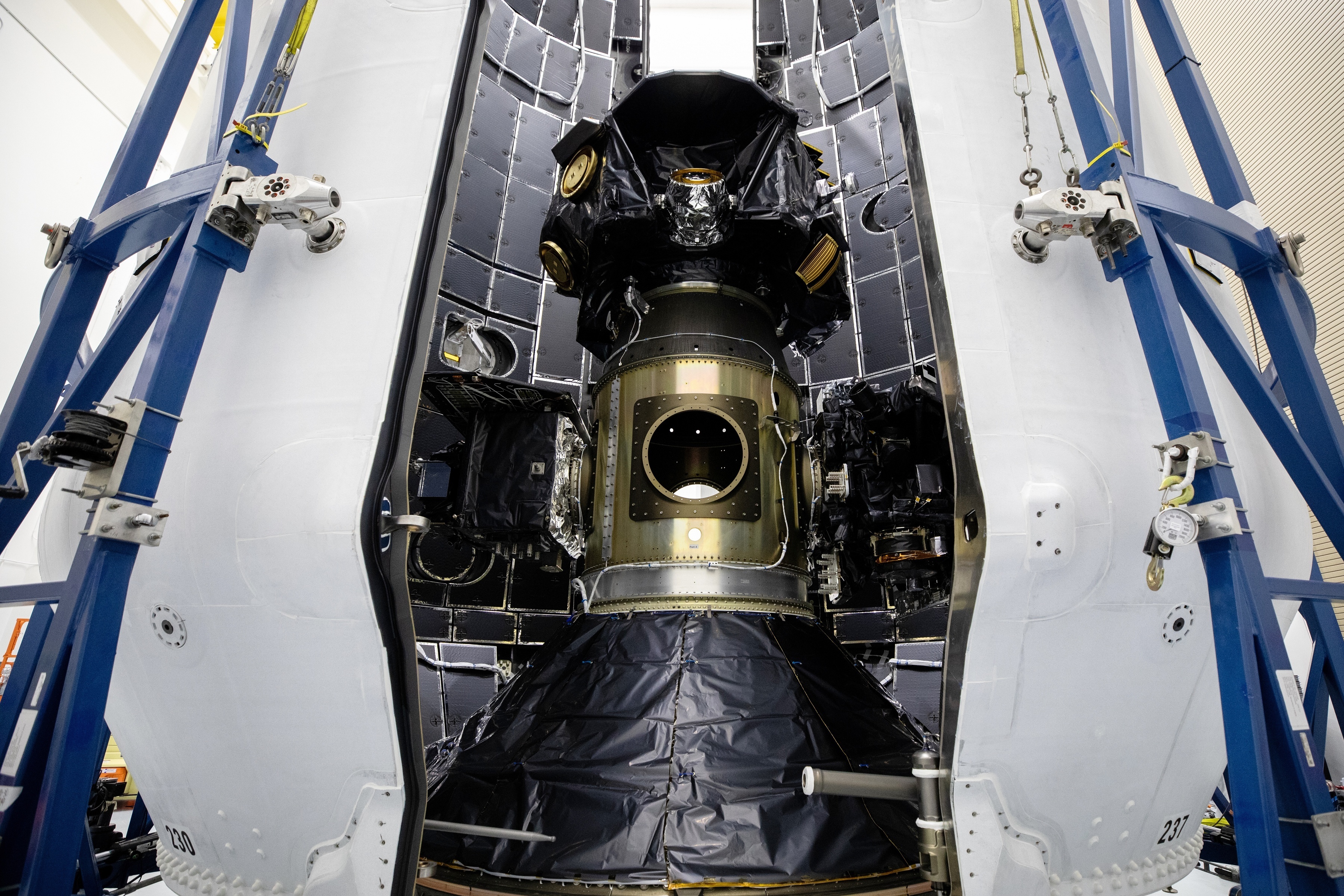 美国宇航局「星际测绘与加速探测器」(IMAP)探测卫星被安装至猎鹰9号火箭整流罩内,肯尼迪航天中心。猎鹰9号火箭将于9月23日执行 NASA 新一批空间天气卫星发射任务,同时将「星际测绘与加速探测器」、卡鲁瑟斯地球冠层观测卫星(Carruthers)及空间天气拉格朗日点1号探测器(SWFO-L1)送入距离地球约160万公里的拉格朗日点轨道。这3颗卫星将用于监测太阳粒子与日球层的相互作用、地冕层紫外辐射对大气影响等空间天气现象,并对太阳风暴等破坏性空间天气提供预警。摄影师:Kim Shiflett