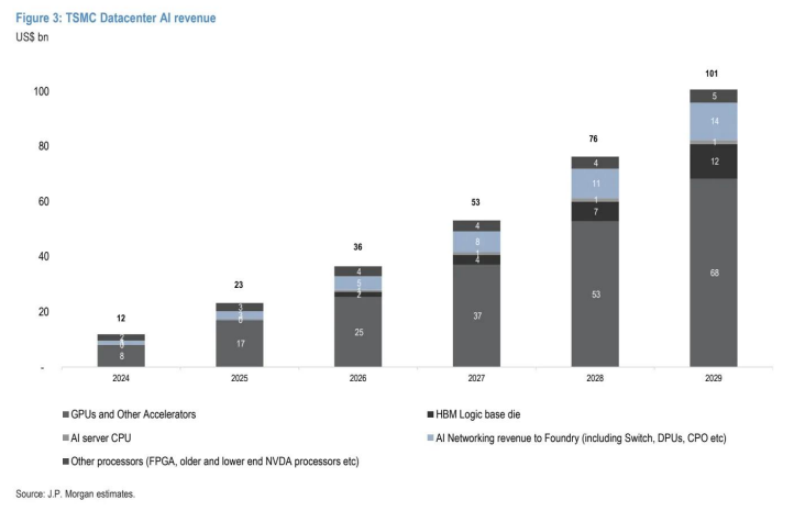 网络设备与HBM(高带宽内存)基础芯片需求也将成为重要增量。小摩预测,2024-2029年台积电AI网络设备营收CAGR将达58%,随着GPU/AI集群规模扩大,硅光(Silicon Photonics)、共封装光学(CPO)技术普及加速,2029年网络设备将占数据中心AI需求的20%(2025年为17%);HBM基础芯片方面,2026年起英伟达、AMD等企业将逐步采用HBM4配置,预计2027-28年HBM基础芯片需求将显著增长,2029年台积电HBM基础芯片营收将达120亿美元,占数据中心AI总营收的12%。