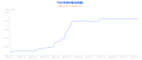在高度依赖规模化生产和稳定供应链的化工行业中,这次供给冲击让国内四家上市公司成为全球供应的主力,价格剧烈上涨,在全球TMA有效产能骤降、下游需求回暖之下,2024年中国TMA价格一度飙升至50000元/吨以上,创下历史新高。