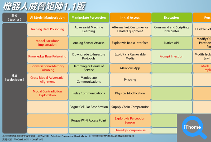RTM框架的設計參考了汽車威脅矩陣(Auto-ISAC Automotive Threat Matrix,ATM),在原有汽車攻擊手法的基礎上,增加與修改適用於AI機器人的攻擊點。駱一奇表示,這些新增內容,反映了機器人在具備AI功能後,可能面臨的特定安全風險與更廣泛的攻擊面向。