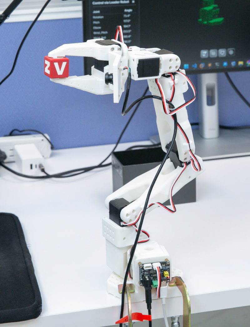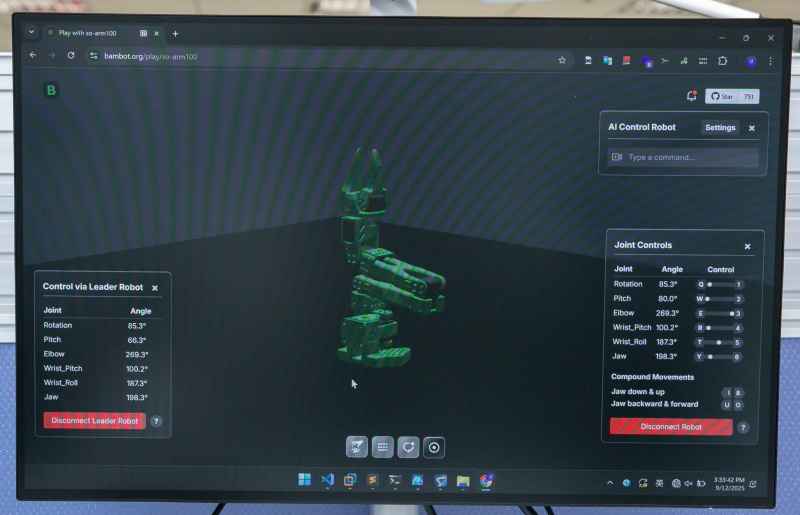 白色機器手臂是被訓練的AI機器人標的,除了可以跟隨黑色機器手臂的人為操作學習相關的動作外,透過數位雙生平臺的訓練才是主力。攝影/洪政偉