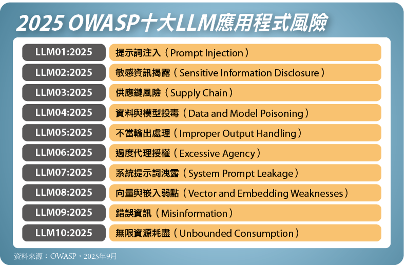 徐士涵將具身AI的潛在安全隱患,歸類為三種類型。第一種是語言模型越獄(Jailbreak),也就是提示詞注入(Prompt Injection)攻擊,透過語言模型對於文本的高度理解力,來製造擾動(Perturbation)或幻覺(Hallucination),使AI規避限制而導致失控,這種手法的可行性高,傷害度中等。從2022年至今,仍是穩居「2025 OWASP LLM十大風險」冠軍的主流攻擊手法。