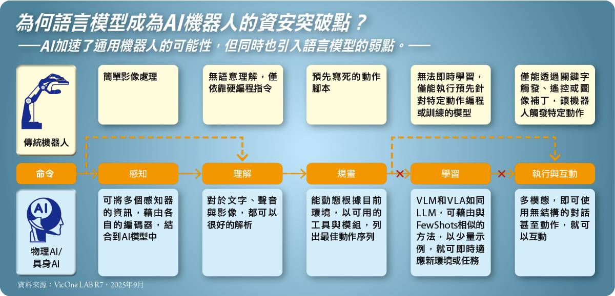 也因為AI大腦的突破,同時引入語言模型的所有弱點,也就是說:具身AI機器人採用VLM或VLA(視覺—語言—動作模型)作為核心,使得駭客能利用語言與視覺的不連續性,進行高度危險的攻擊。