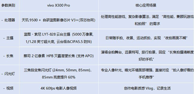 ✨ **双芯协同,突破影像瓶颈**:vivo X300 Pro 结合了强大的天玑9500芯片与自研的蓝图影像芯片V3+,通过硬件级融合实现了前所未有的影像处理效率。全球首发的4K 60fps电影人像视频功能,以及在动态追焦和低光拍摄上的领先表现,有效解决了用户在拍摄动态场景和夜景时的痛点,提供比肩专业设备的影像体验。