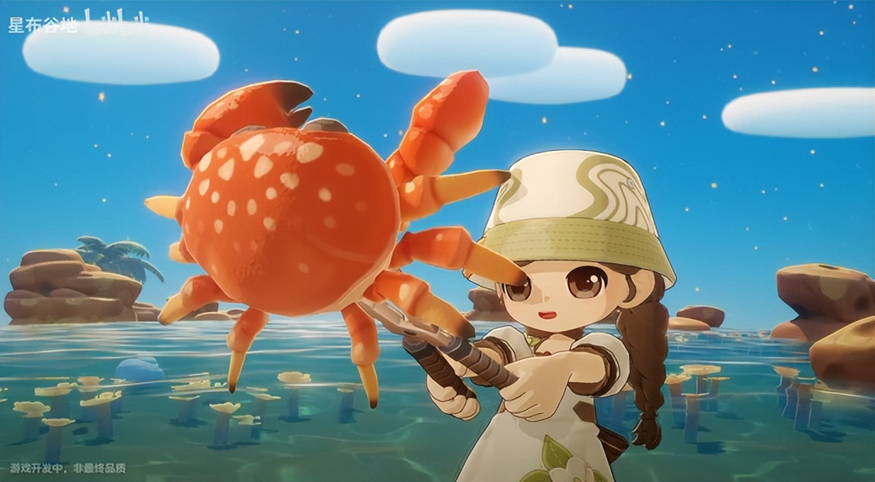 《星布谷地》展示了较为丰富的生活模拟要素。星球上也有大海,玩家可以在海边抓螃蟹,玩家也能种植作物,门前农田中便已有熟透的番茄。此外,玩家可以捕捉蝴蝶、浇花。