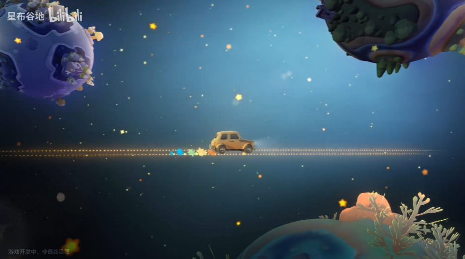 随后,坐上星际汽车喷着星星尾气,玩家便像小王子一样踏上了星际旅行。这也是PV中最令人振奋的部分。外太空的星球外观各不相同,采用了一种lowpoly风格。有的星球是海底主题,有许多珊瑚礁,有的星球则种满了蘑菇和鲜花。每颗星球上有不同的动物居民。