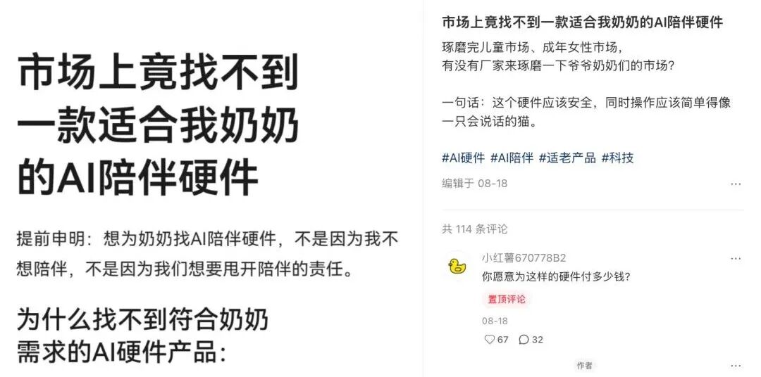 社交媒体有帖子提到,自己想为说云南方言的“高需求”奶奶找一个操作简单的 AI 陪伴硬件,希望能通过实时的交流来帮助老人缓和孤独感,但感到市场上并无合适产品。