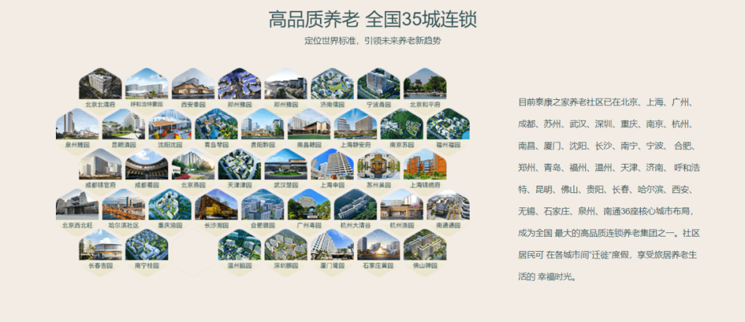 在此情况下,养老机构很难覆盖更广泛的人群。以国内养老社区头部机构——泰康保险旗下泰康之家为例,目前在全国完成36座城市43个项目布局,其中有22城25个社区开业,在住居民近17000名。