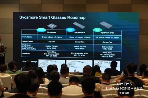 市场与业务开发副总裁Mike Housholder提到,“?Cooling芯片风扇是一款令人感到极其兴奋的产品。过去一年,我们携手客户成功验证了其在智能手机、AI眼镜、SSD等应用中的性能表现,打造出能够真正改变行业游戏规则的产品。”市场与业务开发副总裁Mike Housholder还表示,“MEMS技术是应对设备小型化挑战的关键解决方案,对于追求极致轻薄设计的产品,MEMS技术就是理想的路径。”Sycamore+?Cooling产品亮相,开启AI新时代2024年11月,xMEMS推出了重磅级的Sycamore近场微型全频段扬声器。这款产品采用全新超声波平台,适用于智能眼镜、智能手表等产品。这款扬声器薄至1.28mm,比传统动圈式扬声器轻90%、小70%。与此同时,这款扬声器比上一代产品增加了40倍的低频能量,提供清晰、细节丰富的音频体验。