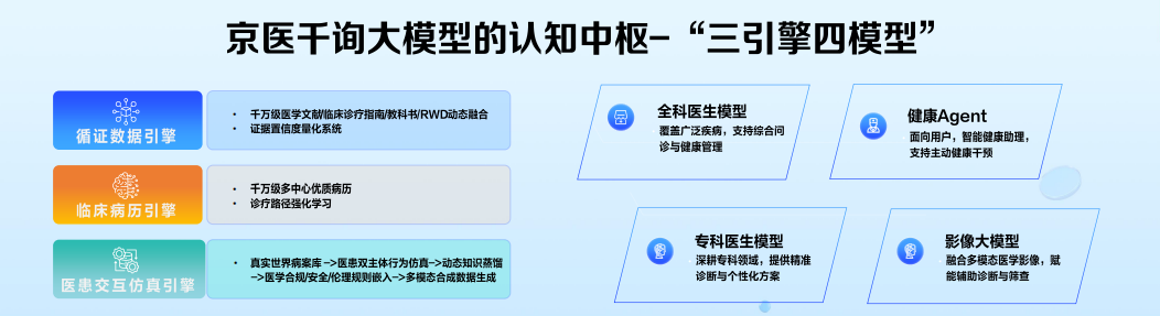 在技术底层,京医千询2.0实现从全科迈向复杂专病的跨越,作为行业首个融合“可信推理+全模态能力”的医疗大模型,其从1.0的“静态规则驱动”跃迁至2.0的“动态循证智能”,打磨形成“三引擎+四模型”底层技术架构,提升了AI在复杂医疗决策中的可靠性与可解释性。